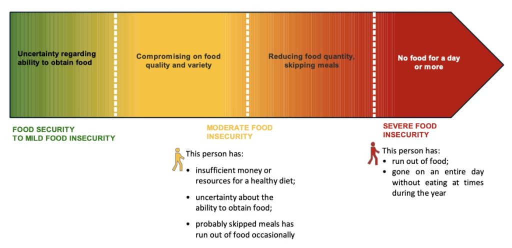 I livelli di gravità di questi fenomeni sono stimati attraverso la Food Insecurity Experience Scale (FIES) sviluppata da FAO (si veda la Figura 1). Un individuo che resta senza cibo per un giorno o più e rimane senza cibo è considerato altamente insicuro dal punto di vista alimentare. (1)