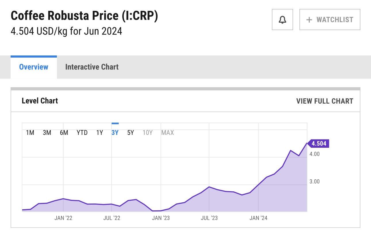 L’impennata dei costi del caffè verde negli ultimi quattro anni – a livello globale, per entrambe le famiglie Robusta e Arabica – deriva dalla combinazione di diversi fattori economici e geopolitici, climatici e regolamentari.