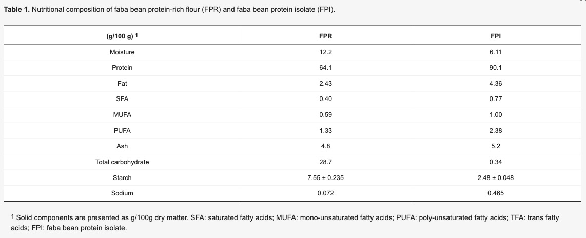 The Protein2Food research project resulted in two food ingredients derived from fava beans. A protein-rich flour (FPR, Faba Bean Protein-Rich Flour) and a protein extract (FPI, Faba Bean Protein Isolate).